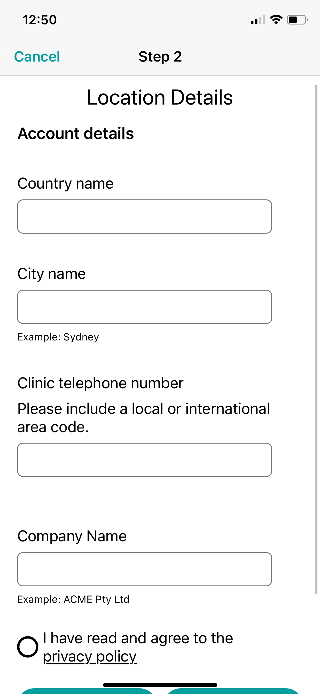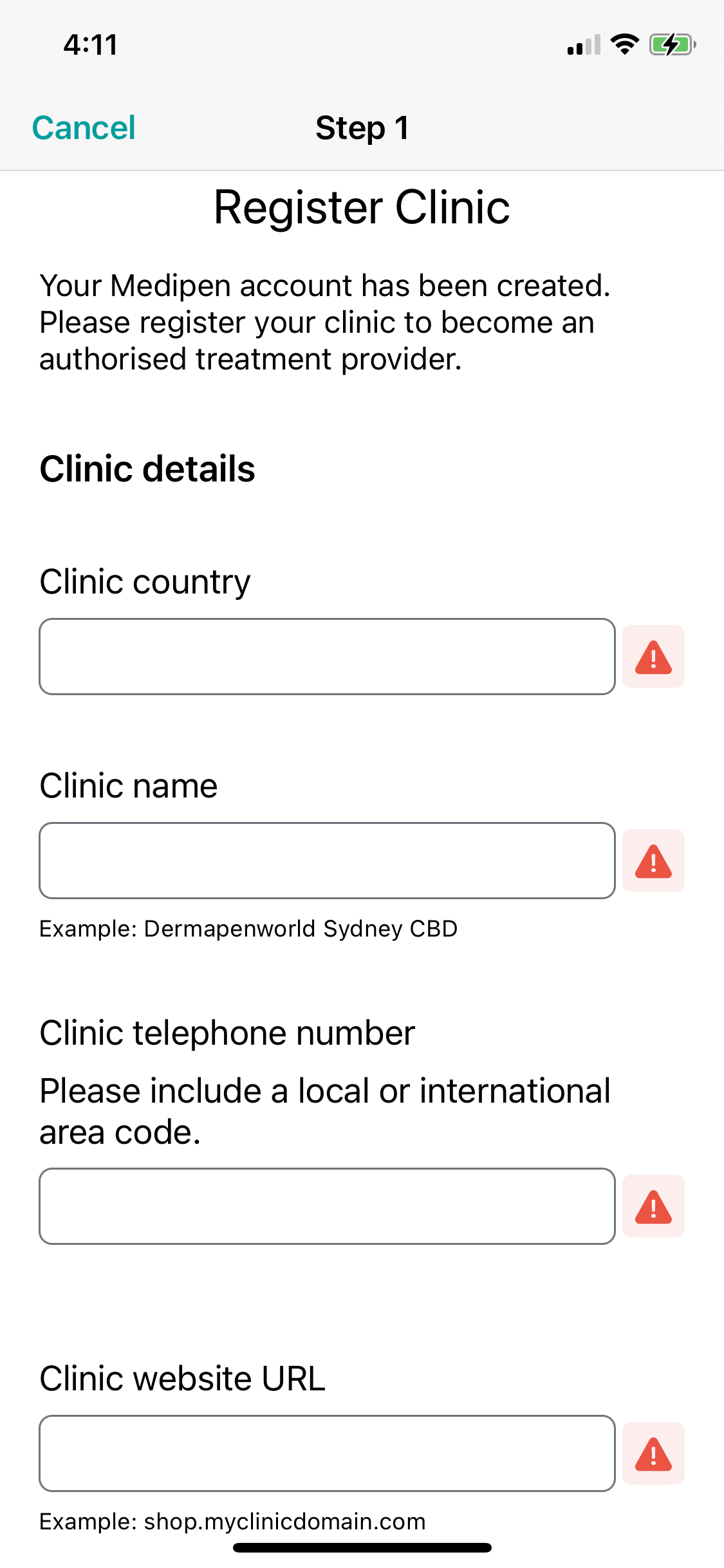 Enter in the clinic country, clinic name, clinic telephone number and clinic website address. Then tap Next.