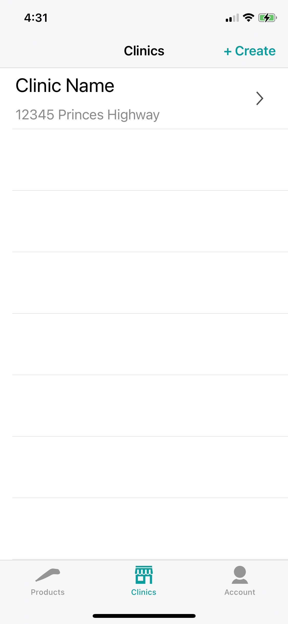 To create a clinic, select the Create button in the top right hand corner
