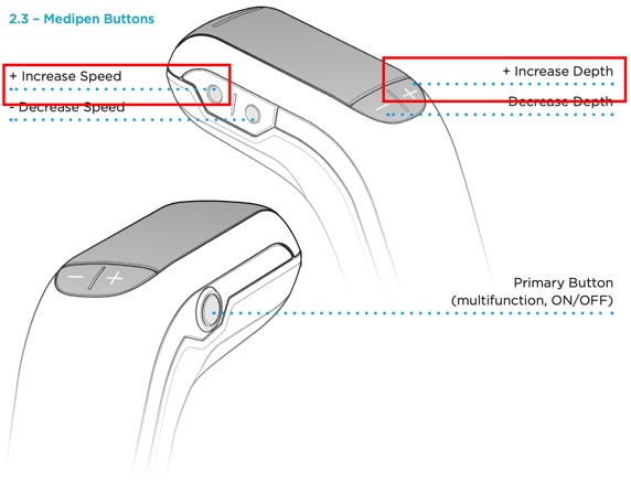 Place Pen into pairing mode by pressing and holding both the Increase Depth (+) and Increase Speed (+) buttons for 5 seconds