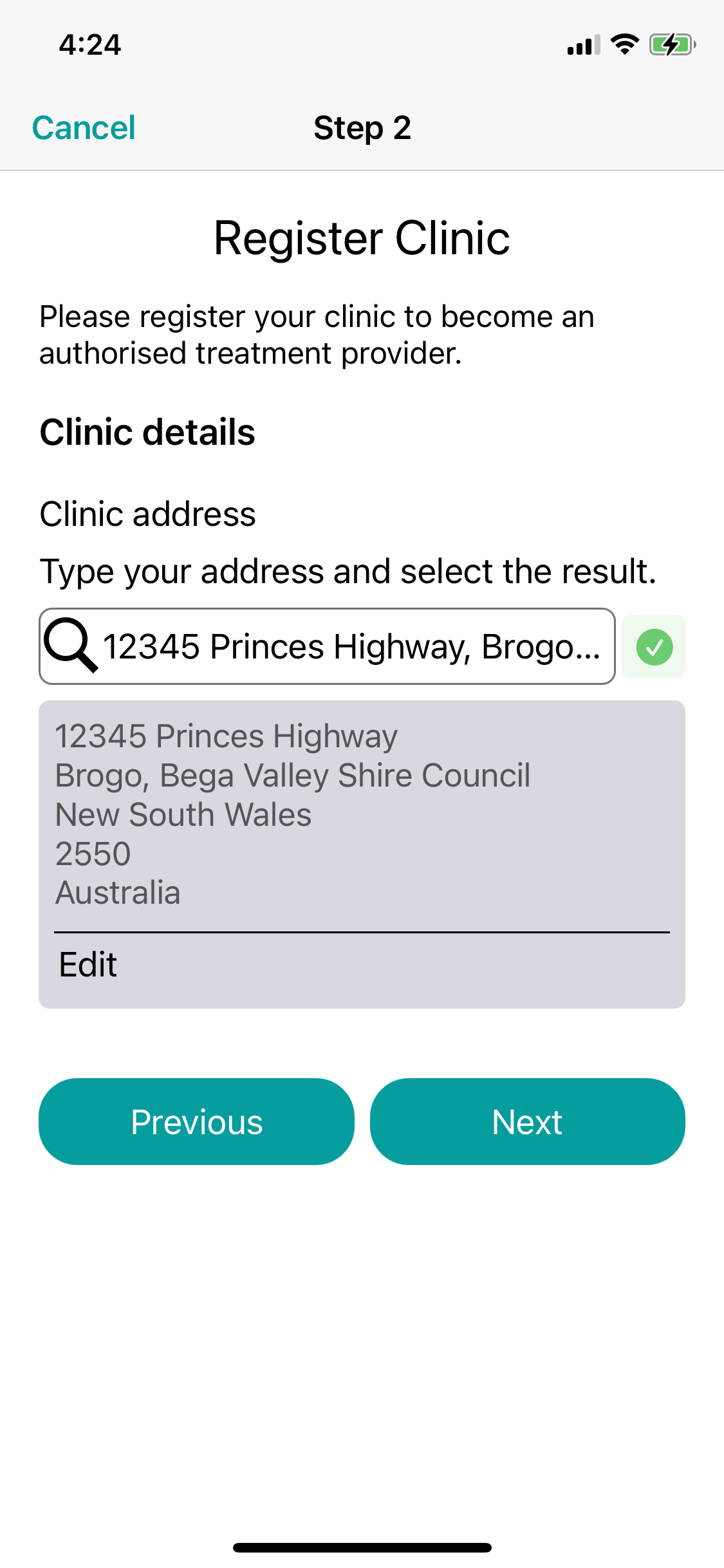 If you need to overwrite the address, tap Edit, then manually enter in the clinic address. Then tap Save changes. Then tap Next. -