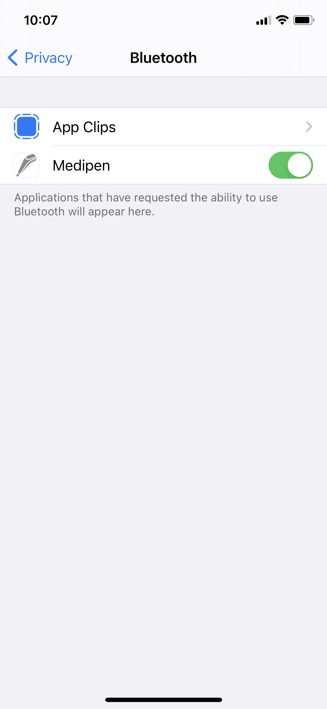 - Ensure that Bluetooth is enabled for the Medipen app (Settings – Privacy – Bluetooth – Medipen)