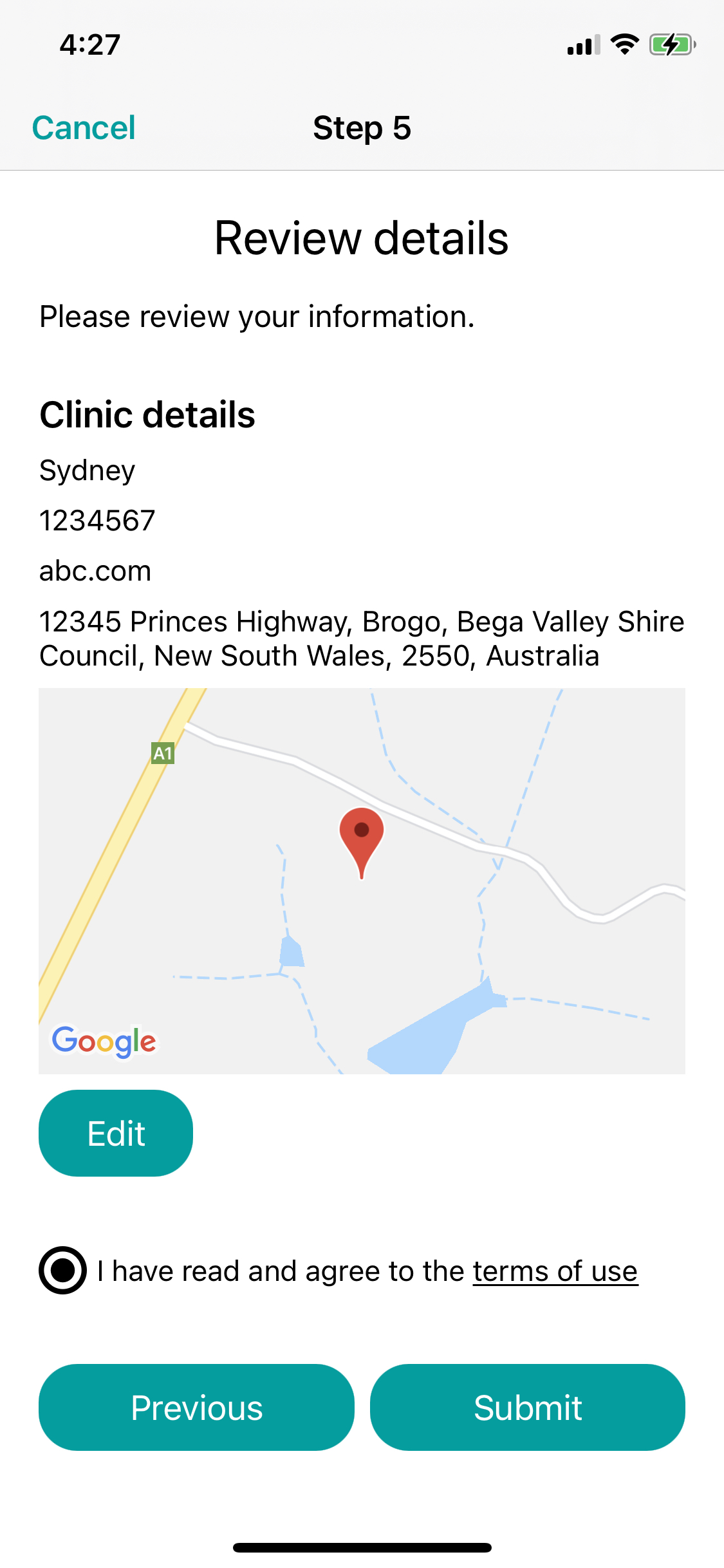 Review your Clinic details (tap Edit to make changes). When satisfied that all information is correct, ensure that The terms of use agreement has been accepted and select Submit.
